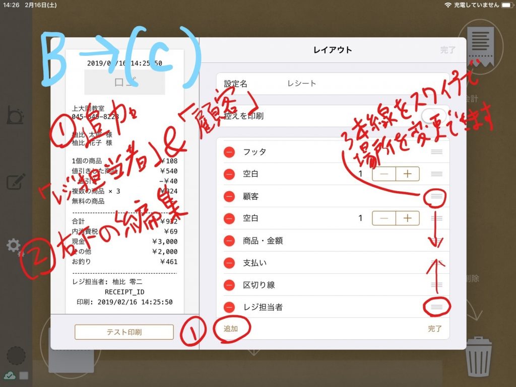 レシートに生徒さんの名前などを表示させる設定